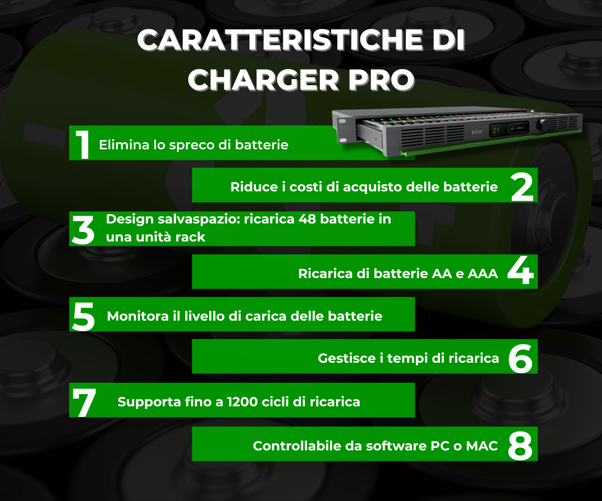 Le batterie usa e getta sono costose e fonte di sprechi. Charger Pro è una soluzione per ricaricare 48 batterie AA/AAA in un'unità rack, aiutando a mantenere le vostre apparecchiature in funzione più a lungo e riducendo i costi da sostenere.