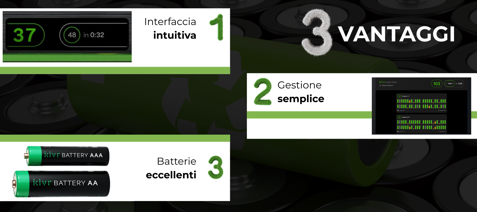 1. Interfaccia intuitiva: il display di KLVR ti permette di controllare facilmente livello delle batterie e tempi di ricarica. Questo significa controllo facile e veloce dello stato di ricarica del tuo dispositivo.