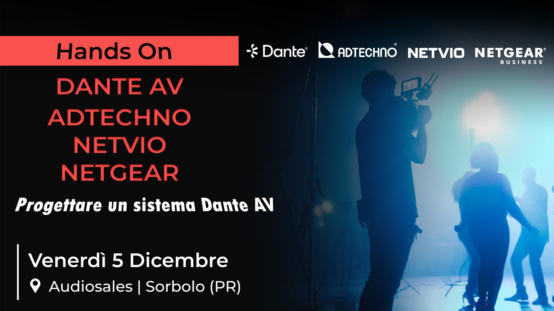 Durante il corso i partecipanti apprenderanno le nozioni e la terminologia fondamentali per la realizzazione di un network dati legato al mondo dello spettacolo e alla distribuzione del segnale AV tramite protocollo Dante, mettendo in opera un setup che prevede l’utilizzo di Encoder e Decoder Netvio, Dante AV Ultra con ADTECHNO, le telecamere PTZ Canon e gli switch Netgear della serie M4250 – M4350.